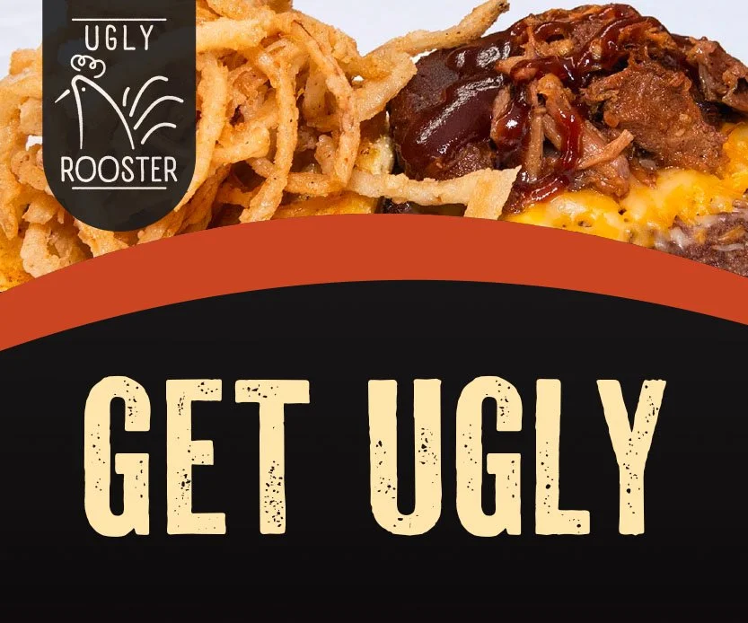 Ugly Rooster Rebrand, 2023, Indesign, (top left) 833 x 694 pixels, (top right) 833 x 1666 pixels, (bottom) 2022 x 250 pixels